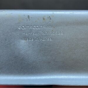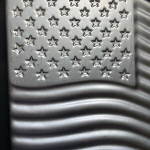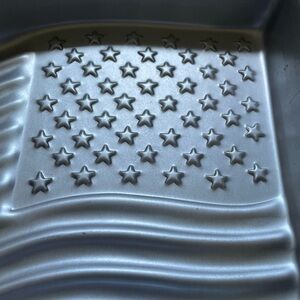 Amscan American Flag cake pan. Has some scratches and wear normal for age. Edge has small bend will not affect baking. Has one yellow spot on outside possibly from adhesive. Please see photos.