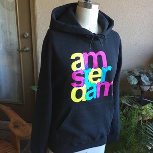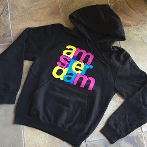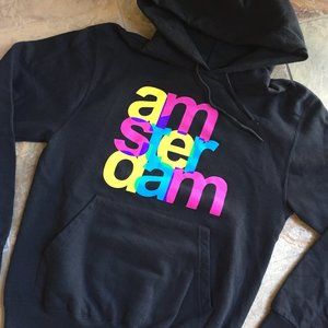 SG “Amsterdam” sweatshirt in black, with yellow, pink, and blue accents. Size small. New, never worn. Front chest: 20" Length: 25.5"