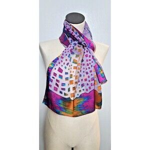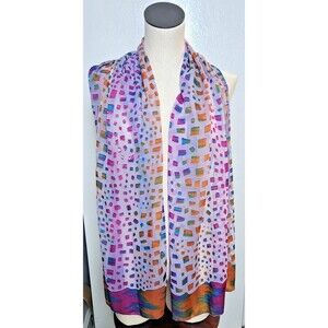 Beautiful sheer/velvet textured Amtal scarf. The scarf is rectangular with purples, pink, blues and oranges throughout. Very pretty. My home is smoke and pet free.