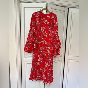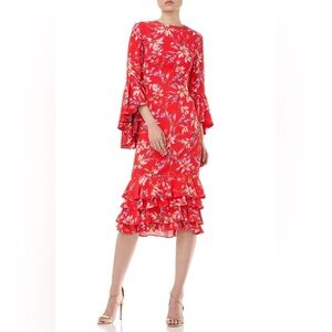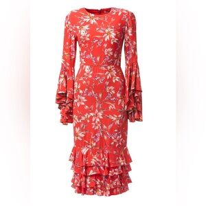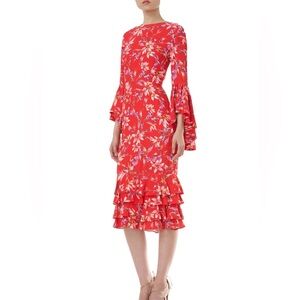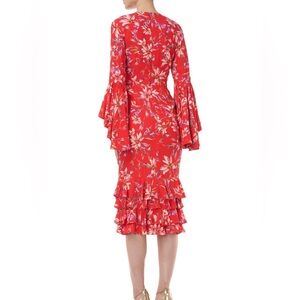 The bold hues and elongated sleeves on this midi ruffle floral printed Alexia Dress create a stunning look.