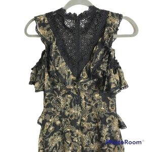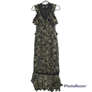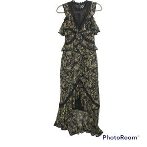 AMUR Edna dress. This dress reflects the regal and classic luxe found within nature. The timeless elegance of chiffon, ruffle, and lace canvass a floral print inspired by the art of Mughal royalty. Cold shoulder design with lace trim details.