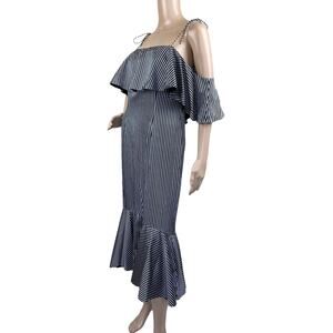 Amur Francesca Women's Black White Satin Stripes Cold Shoulder Ruffle Dress