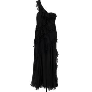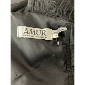Amur 'Harlow' Black Silk Dress Size 0: partially lined, boned bodice, asymmetrical ruffling, scalloped trim and a hidden back zipper.