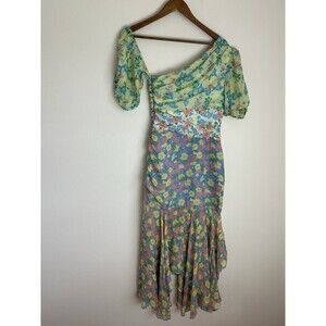 Amur Jaylah Patchwork Floral Print Silk Asymmetrical Midi Dress Size 2 Fairy