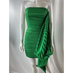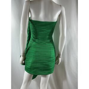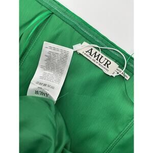 Amur 'Kayleigh' Green Polyester Dress Size 2: fully lined, hidden side zipper closure, boned bodice with non-slip silicone neckline strip, pintuck satin fabric, cascading ruffle accent fabric at side, measurements: 15 inch width x 24 inch length.