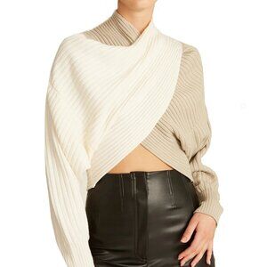 Super cool, Amur Milena Sweater. Super soft, 100% Merino wool. Super sexy cropped design. Unique crisscross wrap design. Beautiful color block ribbed pattern in cream and tan. Similar in style and design to some of Sea New York, Zimmerman, Ralph, Lauren, Vince, and free people. Wear this beauty with your favorite Ralph Lauren collection black leather pants, Christian Louboutin’s and Gucci bag.