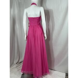 Amur 'Paula' Pink Viscose Gown Size 2: fully lined, hidden back zipper closure, crisscross halterneck styling with back loop button closure, pleated chiffon fabric with bust cut-out.