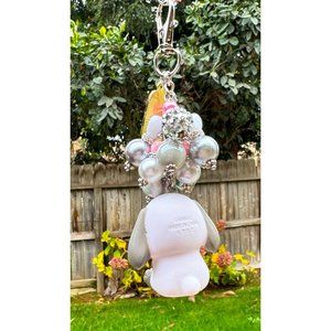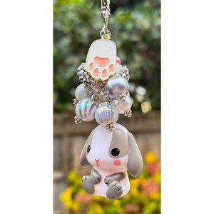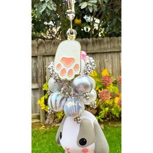 This handcrafted keychain showcases sparkly/shiny grey & white beads throughout, along with a super cute enameled bunny paw charm!