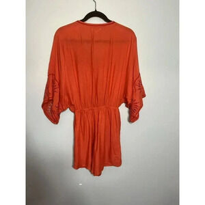 Excellent condition! This Boho shorts romper is super cute and flowy! The embroidered cutouts add lots of detail! The shorts are fully lined. The color is a beautiful orange ish red.