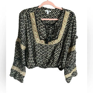 Amuse Society Boho Peasant Blouse Black Floral Print Tassel Top Size Small