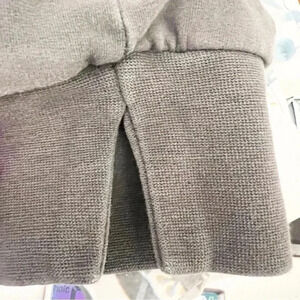 Amuse Society Charcoal Gray Keller Fringe Sweater. Pull over style, scoop neck, and fringe across front. Small sleeve slits and side slits. Back is slightly longer than front. Charcoal gray coloring. Size large.