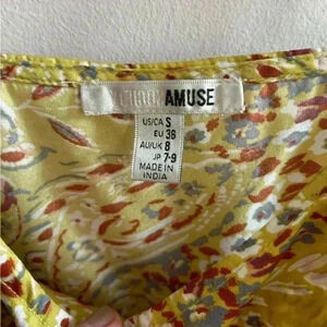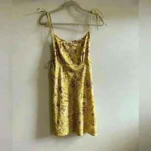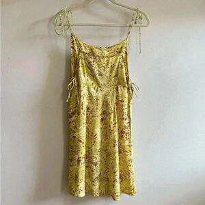 Fun and flirty mini dress from Amuse Society! A pretty yellow/green color with dark red floral patterns. Has tied spaghetti straps and also ties on the sides for a unique look. Light breathable material, and in excellent pre-loved condition!