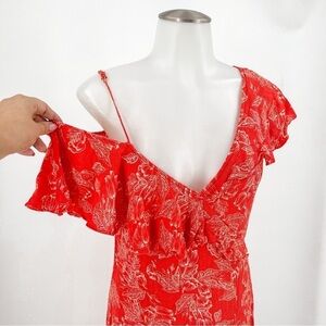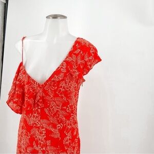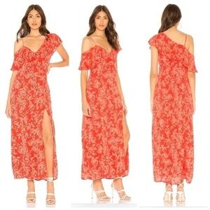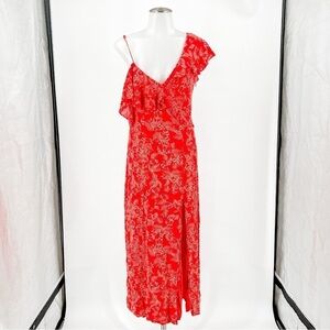 The Amuse Society Midnight Orange Floral Print Asymmetrical Maxi Dress is sure to start a spring romance! Lightweight viscose, in a simple cream floral print, shapes a ruffled, asymmetrical bodice with a fluttering short sleeve, skinny strap, and off-the-shoulder sleeve. Long, flowing maxi skirt has a sexy side slit. Hidden side zipper.