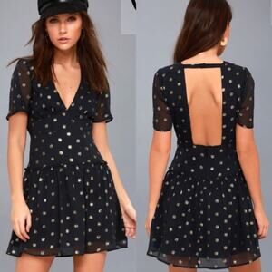 Amuse Society Midnight Love Black and Gold Polka Dot Backless Dress. Featuring lightweight, gauzy, woven fabric, deep V-neckline, relaxed bodice with a set-in waist and short sleeves, breezy open back (fastened with a covered button) tops a cute, ruffled mini skirt, and hidden back zipper. No rips, tears, or pulls.