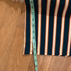 striped pants in dark teal, orange, & cream. Tie front with front zipper.
