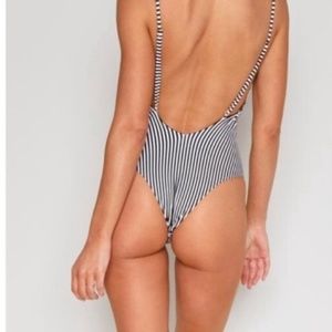 -Black & White vertical striped one piece with lace up & tassel detailing!