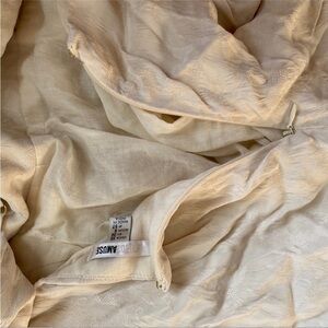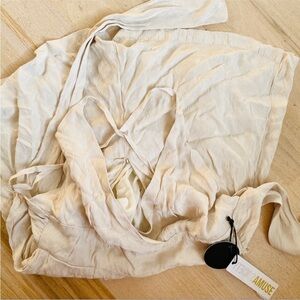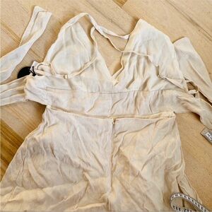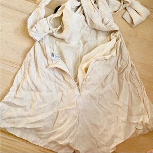 This playsuit has adjustable straps, a back tie closure, hidden back zipper, pleated short detailing, and the slightest hint of palm embossing thorughout.