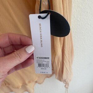 AmuseSociety Blouse, New, Size Medium, Peach Color, Beach Vida Bling, Lightweight with Ties on the End of the Sleeves