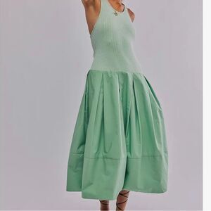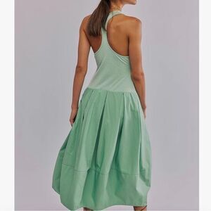 This adorable Amuver dress features a fitted ribbed-knit tank bodice with a halter-style back and a voluminous bubble midi skirt that’s ready to twirl! The soft mint green hue gives it a dreamy, effortless vibe — ideal for vacations, casual weddings, brunches, or just soaking up compliments.