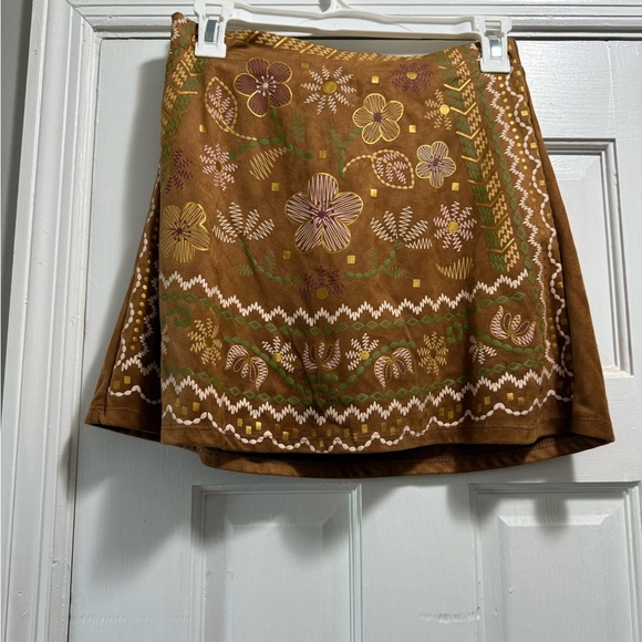 Stylish brown skirt with intricate floral embroidery. A-line silhouette. Ideal for versatile wear.