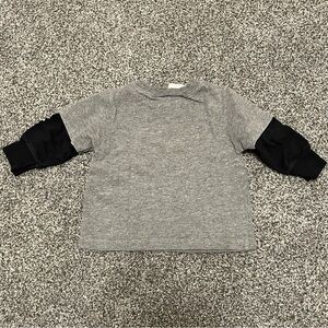 This grey and black shirt from Amy Coe has the appearance of having a long sleeve shirt under a short sleeve shirt. Grey shirt with white skull print. Black shirt has tattoo design down one sleeve with a skull.
