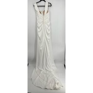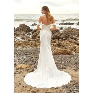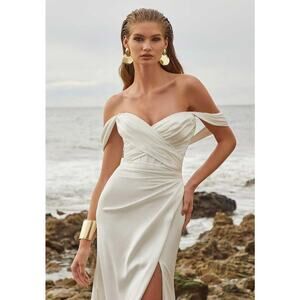 Channel your inner Greek goddess with the Morilee Megara designer wedding dress. This Grecian-inspired gown drapes elegantly around your figure, crafted from luxurious liquid satin that shimmers with every move. The bodice is a showstopper, featuring a striking crisscrossing drape with a peek-a-boo of exposed boning for a cinched and structured silhouette. Seamlessly transitions into a faux-wrap skirt that flatters your curves and offers a touch of modern sensuality with a sultry high slit. Classic buttons cascade down the hem, adding a touch of timeless elegance. Detachable off-the-shoulder sleeves provide versatility, allowing you to transform your look from a romantic ceremony gown to a more contemporary reception outfit.