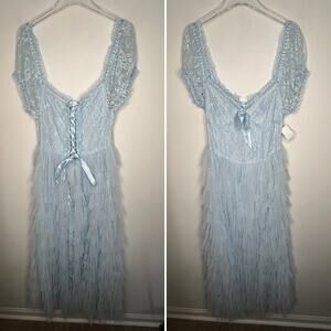 New with tags, perfect condition. MSRP: $375 Puff lace sleeves Lace-up back Fitted corset bodice Tiered ruffle maxi skirt Approx. measurements: Pit to pit: 19" Waist: 32" Length: 58" Please comment with any questions you may have about the item, and I will do my best to answer them ASAP. Thanks for shopping my closet!