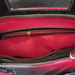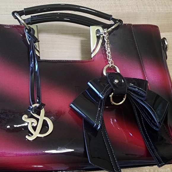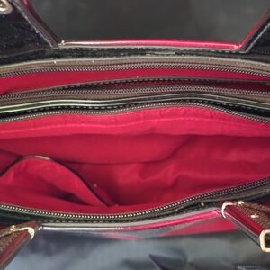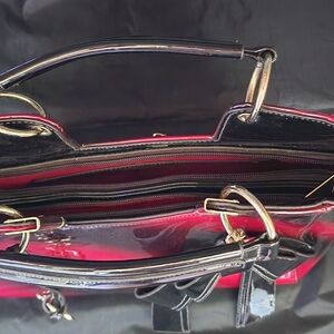 Gorgeous pink red black luxury Handbag. Patented leather with top black handles, gold accents, 2 zipper pockets inside organizer pockets inside, 1 zipper pocket outside, black & gold bow decor, fabric lining