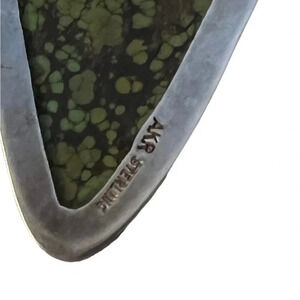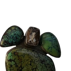 my Kahn Russell Turquoise Smokey Topaz signed Pendant Brooch Amy Kahn Russell is well known for her naturalistic approach to jewelry trends inspired by cultures in her travels. Every piece is individually designed. Set in sterling silver it measures approximately 2 inches wide and 3 inches long. It is marked AKR Sterling. Catherines Is a closet for anyone who is looking for something different , unique and high-quality.