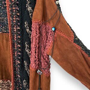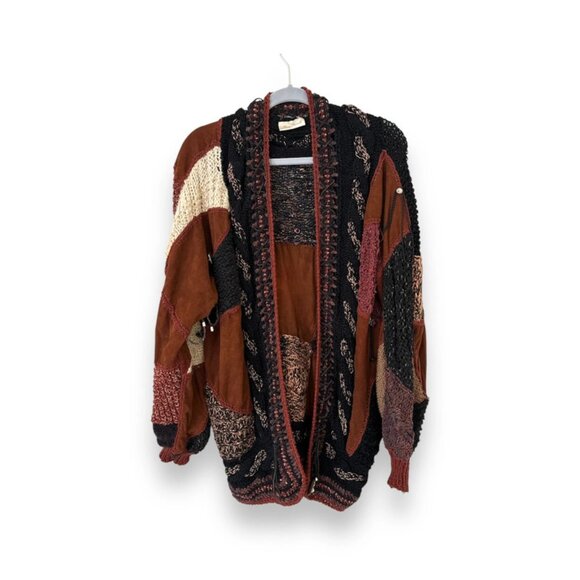 ▪️Step back into the bold and eclectic 1980s with this unique Amy Penzell sweater cardigan. This stunning piece features a patchwork design of knit, crochet, and suede fabrics in rich earthy tones of rust, black, and cream. Handcrafted detailing such as beaded embellishments, braided trims, and decorative buttons make this cardigan a true wearable piece of art. Oversized and open-front style adds comfort and versatility.