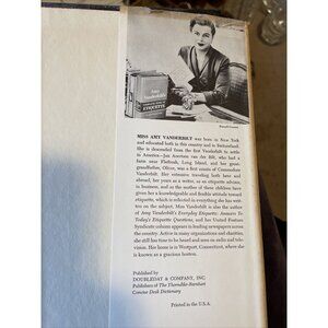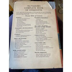 This is a vintage 1958 hardback edition of "Amy Vanderbilt's Complete Book of Etiquette" by Doubleday & Company. It features a red and blue cover, and comes with 2 editions - one with a dust jacket and one without.