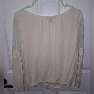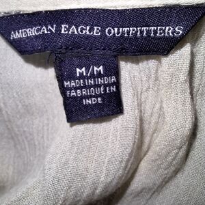 This is an American Eagle sheer and lace low-cut top in a size medium. It's pre-loved and in great condition (see pics). Breezy, airy, lightweight, coastal, beachy, loose-fitting, summer, lagenlook blouse. 21" PTP, 22" length