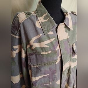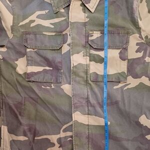 Classic military-style jacket with a rugged look. Features a military Army camouflage pattern. Ideal for outdoor activities. Hunting, fishing, hiking, sporting. 2 breast pockets with hidden double button closure. slit side pockets. inside pockets. heavy denim. double button adjustable wrist. hidden zip up and button up the front. extra button included. pre-owned vintage coat. i dont see any stains, rips, tears, or fraying. all buttons intact and zipper zips freely. coat is in very nice condition. see pictures. they are part of the description. measurements are approximate.