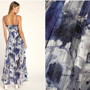 Walk into the room looking like a dream with the Lulus An Enchanting Dream Navy Multi Print High-Low Maxi Dress! Stripes of satin panels (with shiny silver lurex threading) sweep across this lightweight woven chiffon dress that boasts an abstract white and purple floral pattern, adjustable straps, and a surplice neckline. A pleated bodice atop a high fitted waist falls to a flowy high-low skirt. Hidden back zipper/clasp. Worn once - very good condition