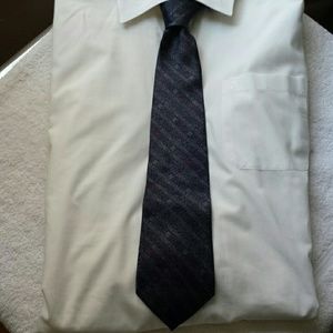 A 100% Italian Silk Necktie. Predominately Blue and Gray with Maroon highlights.