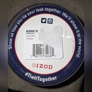 This is an Izod men's must-have 3 piece style set. It has a bowtie, shoestrings, and a handkerchief. The bowtie is green with a blue turtle print, the shoelaces are black, and the handkerchief is a matching blue to the turtle print.