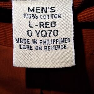 This is an LL Bean men's long sleeve button-down in a size large. It's a rust red color soft corduroy material. It's pre-loved and in excellent condition. Business casual, office, work, play, church, or any casual occasion, or just lounging around.