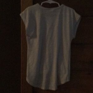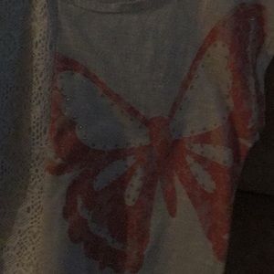 It's an off white t-shirt with a salmon colored butterfly one it. With a little lace on one side. Very pretty and nice