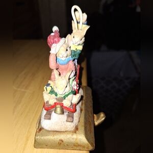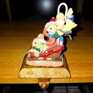 This is an unbranded Mouse and sleigh stocking holder. Its base is 2.5"x3.75" and stands 5" tall. It's pre-loved and in great condition. It has a small chip on the hat (see pics). Christmas, holiday, festive, cheerful, Hanukkah, mantel, decoration.