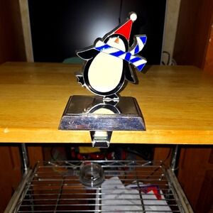 An unbranded Penguin Stocking Holder It's base is 4"x3" and stands 5" tall.