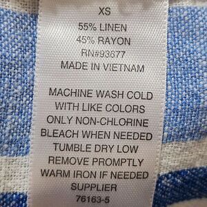 The product is a pair of women's linen pants in size XS with a green and blue striped pattern.