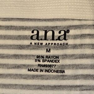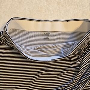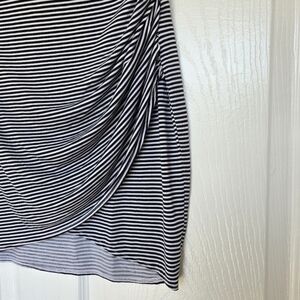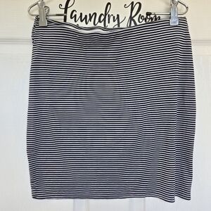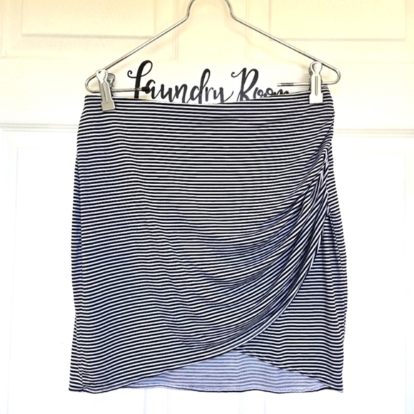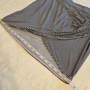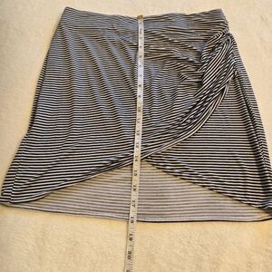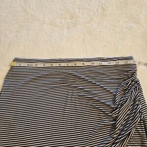 95% rayon, 5% spandex. Black and white striped mini skirt. Runched side. Elastic waist. Stretchy t-shirt like material. Soft and comfortable. Size medium.