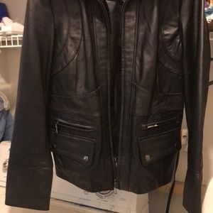 NEVER WORN, all protective papers and tags intact, no damage, black leather with fur , MEDIUM women’s