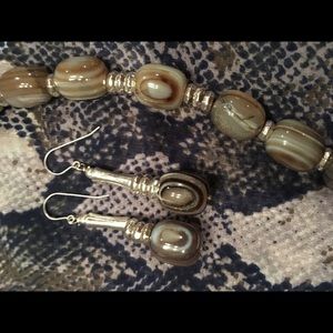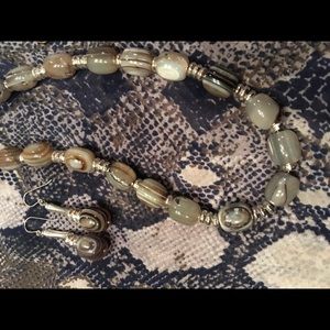 Ana Large Khaki and navy sheer tunic blouse with striped quartz custom matching necklace and earrings