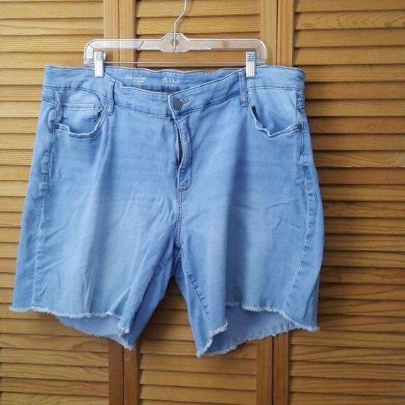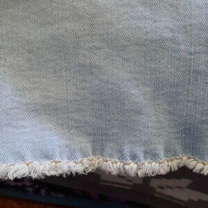 Ana Mid Rise Fayed Hem Denim Jean Shorts Size 24. Measurements are approximate. Waist 21 inches. 12 inch rise. 8 inch inseam. 99% cotton 1% spandex. Fraying on pockets. Small white spots. Looks like the weave.