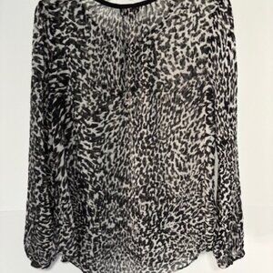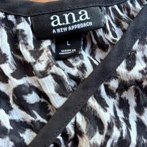 Ana New Approach L Black White Animal Print Tie Neck Sheer Neutral Statement