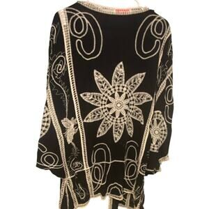 Ana & Rose Black Beige Embroidered Boho Kimono Cardigan 1X Festival Layer