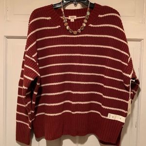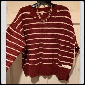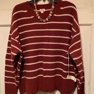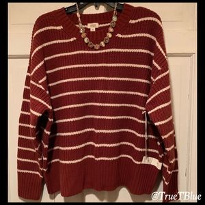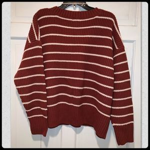 Beautiful dark toffee and white striped drop sleeve sweater. Brand new with tag—very comfy and is a thick knit. One minor thick stitch on the front—see pic above. Not noticeable when worn.