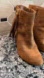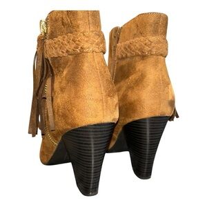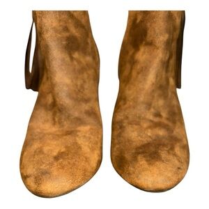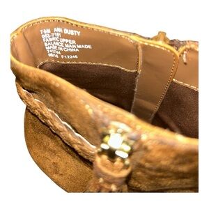 Pre-loved, gently used in excellent condition. Soft brown suede with side zipper, decorative buckle, and stacked heel. Stylish and comfy.
