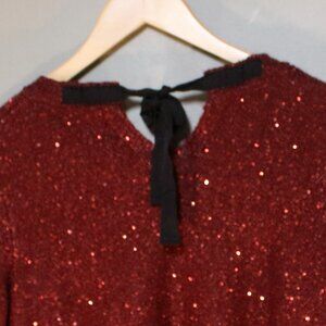 This beautiful and festive burgundy red sweater in very good, preowned condition. It has tiny little sequins throughout and the perfect amount of sparkle. Pullover style. Back has a cutout detail with black ribbon tie at the back of the neck.. Perfect as a festive holiday sweater.